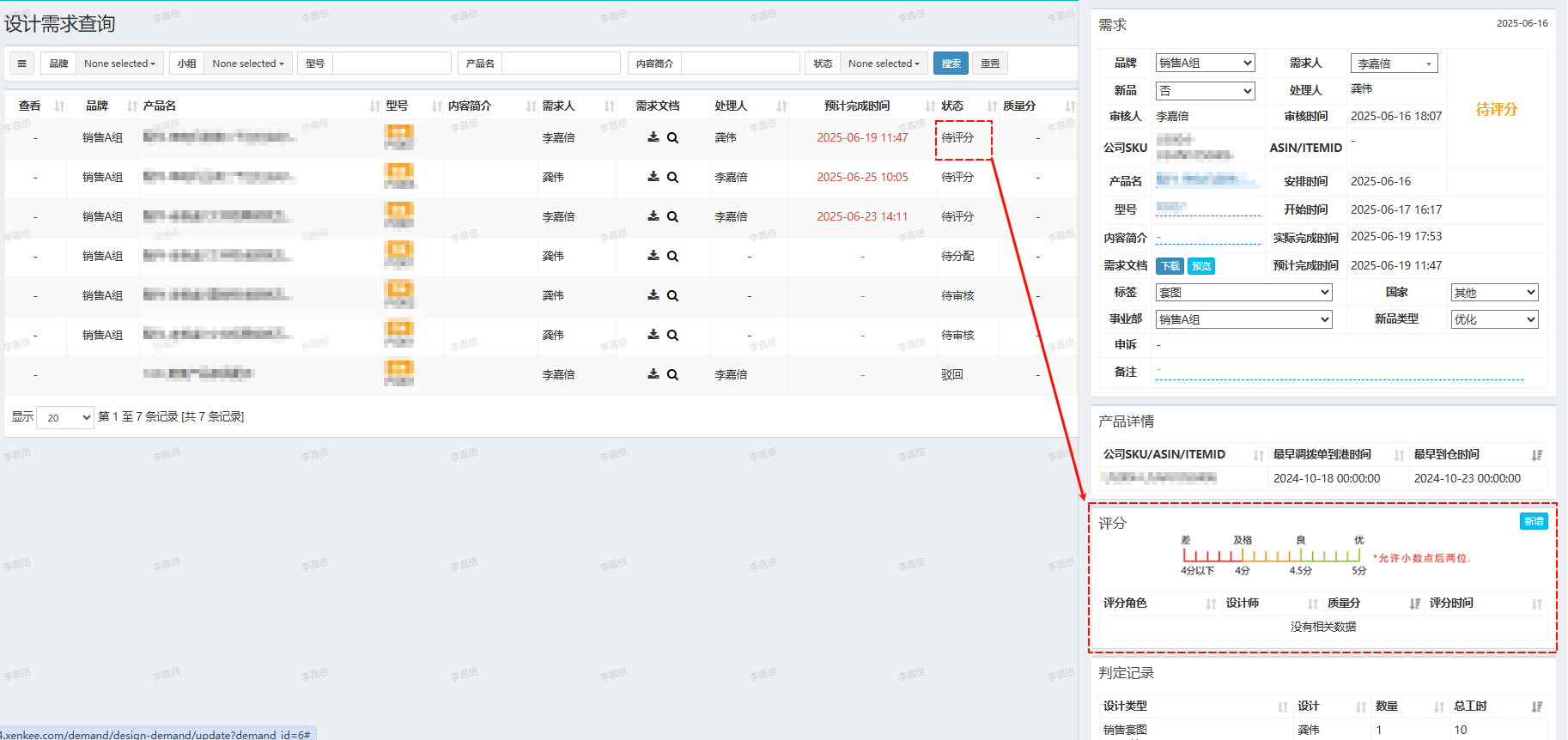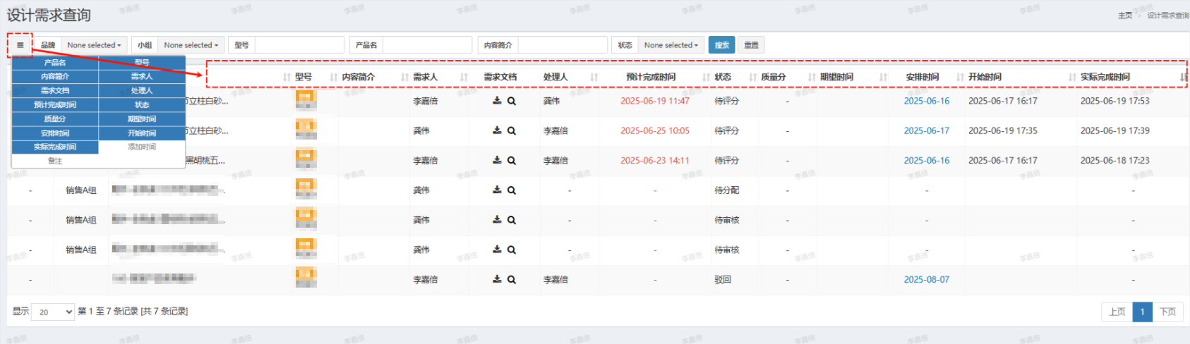 品牌、小组、状态--等筛选条件可按需勾选(支持单选/多选,默认显示全部);