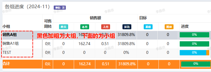 - 隐藏小组汇总:会在“各组进度”里面,隐藏销售小组的统计,只显示大组的;