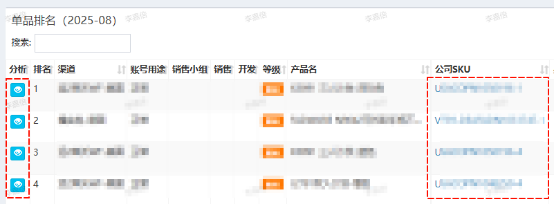 点击产品前小眼睛可跳转到单品分析页面,点击公司SKU可跳转平台产品详情页