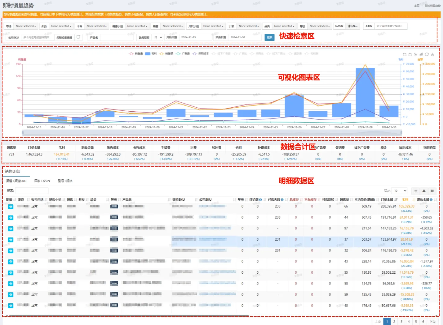 | 数据汇总 | 汇总展示所选范围内的销量、交易额、毛利及各类成本 |