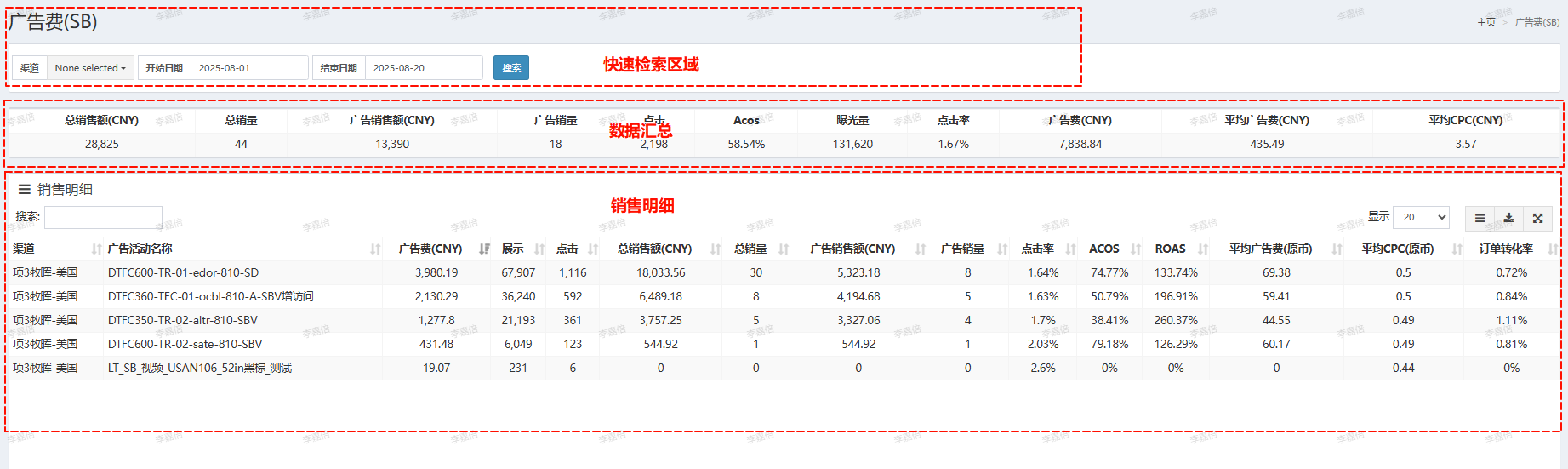 | 销售明细 | 渠道下每个广告活动的数据 |