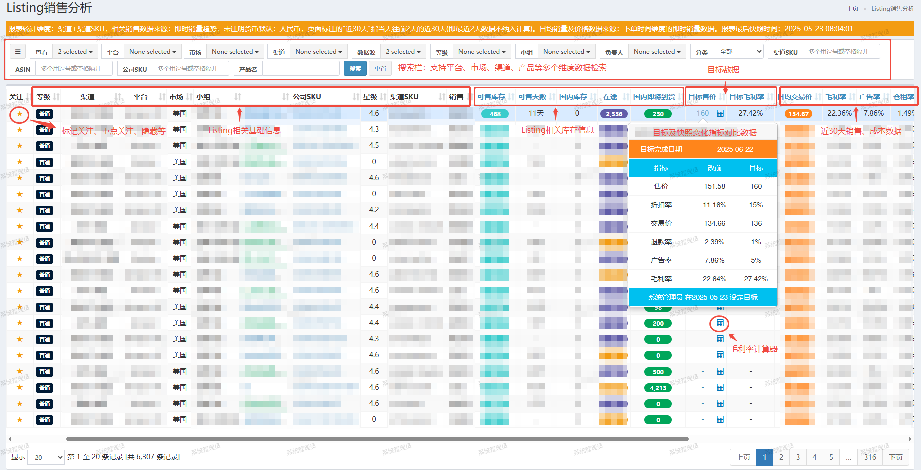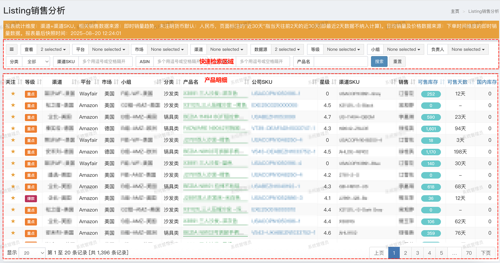 | 快速检索栏 | 支持渠道SKU、ASIN、公司SKU及其他信息维度的查询 |