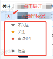 点击列表中的五角星图标,可选择对应的标记类型,支持:不关注、关注、重点关注、隐藏。