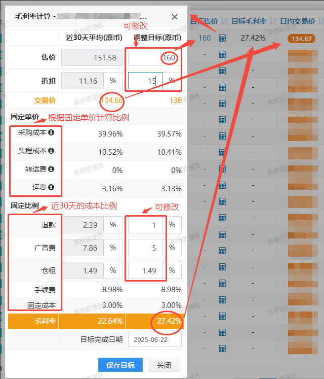 调整目标值(默认显示跟第二列相同指标值,目标售价如有调整显示为最新目标售价)。其中,目标售价、折扣占比、退款占比、广告费占比、仓租占比可人工调整。