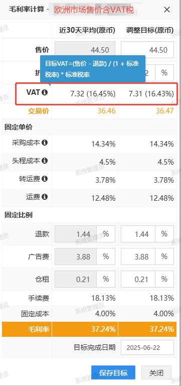 *计算公式:目标交易价=目标售价 (1-折扣占比-VAT占比),其中欧洲市场才显示VAT。