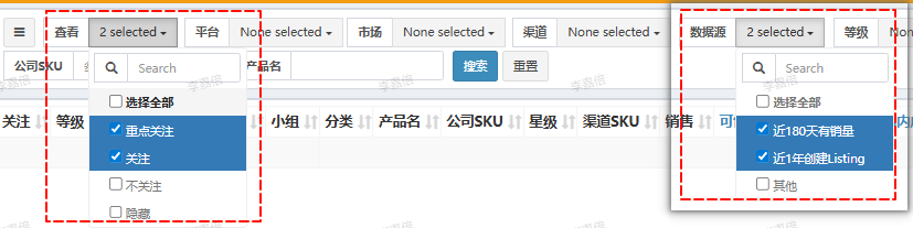 - 查看:用于筛选关注的 Listing,可选值:重点关注 / 关注 / 不关注 / 隐藏,支持多选;默认选中 重点关注、关注。