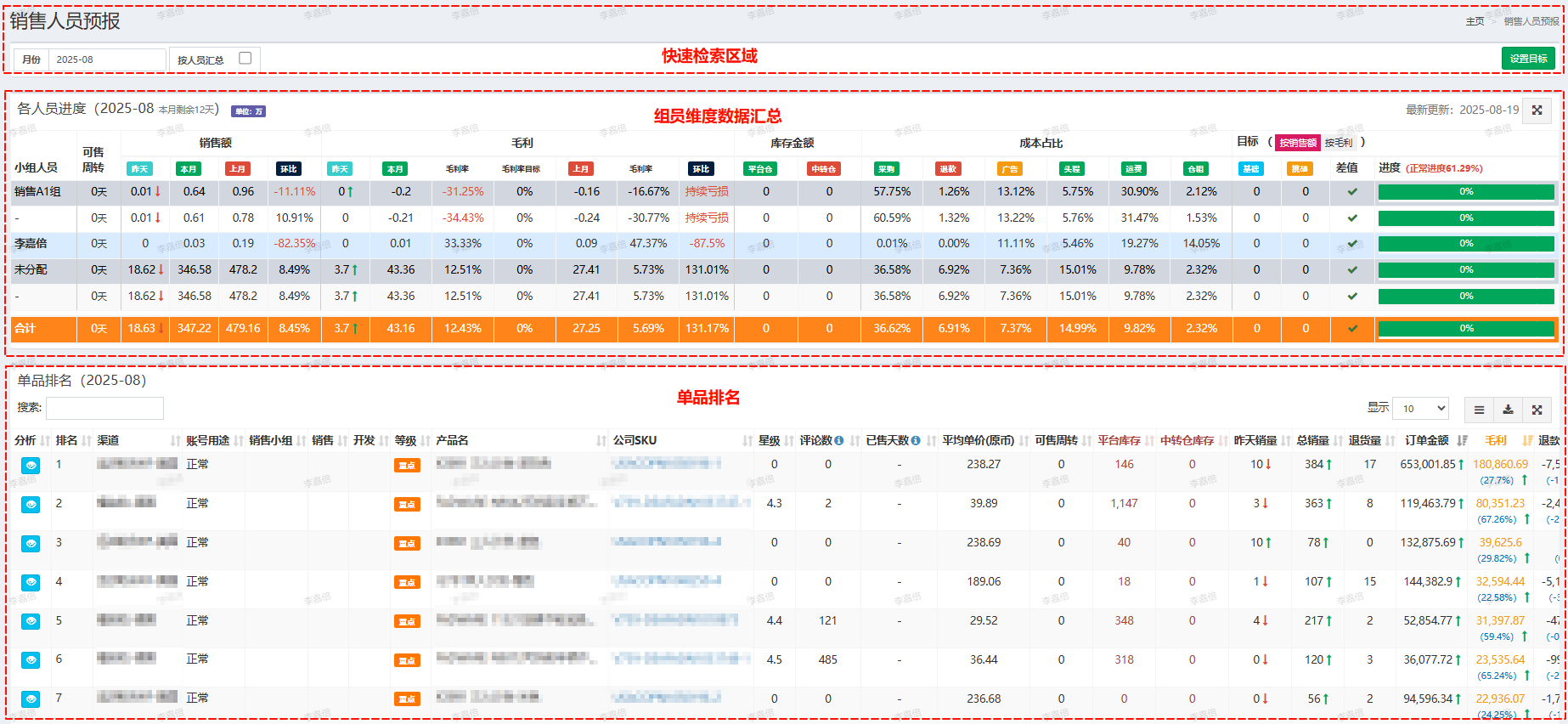 | 单品排名 | 具体到每个产品的库存、成本、毛利、广告费及其他费用数据 |