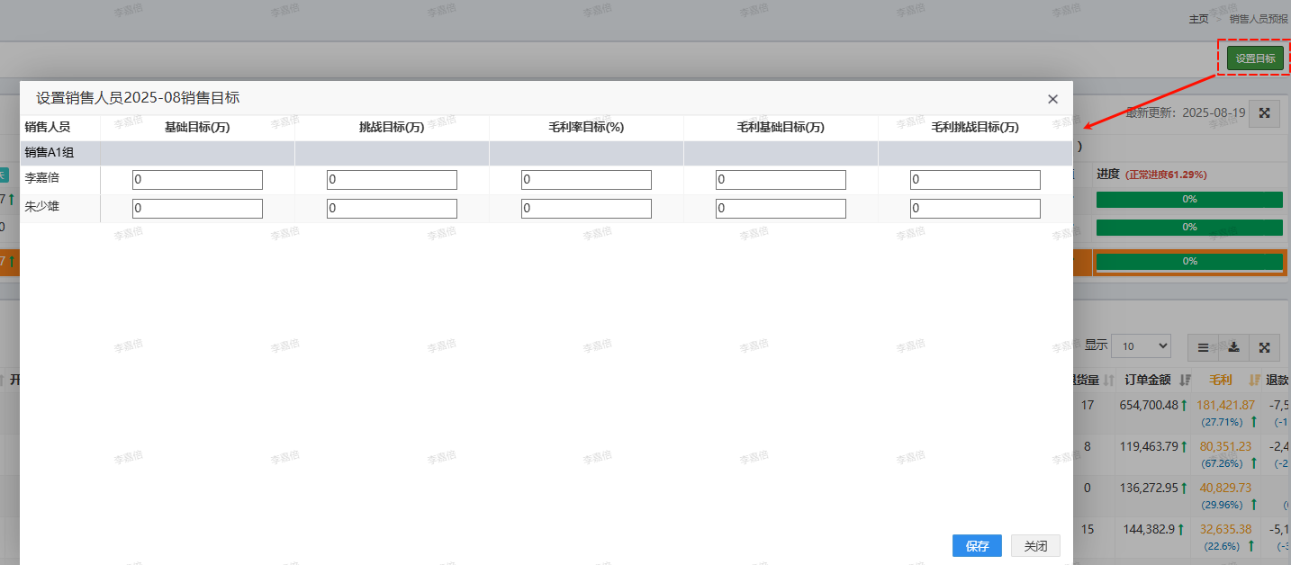 - 设置目标:可以设置小组人员的月销售目标,仅影响当前页面的进度条显示;