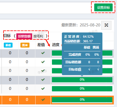(1)按销售额/按毛利:用于切换销售额和毛利目标,影响进度条显示