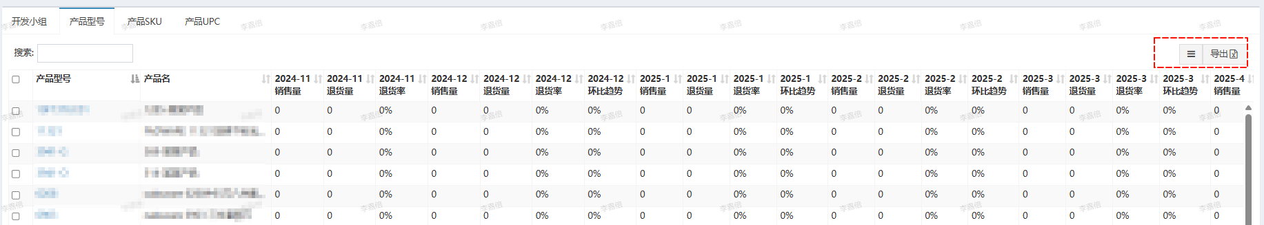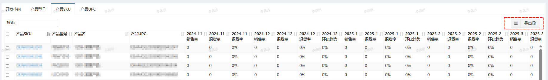 - 支持 开发小组/产品型号/产品SKU/产品UPC--等四个维度的数据统计展示