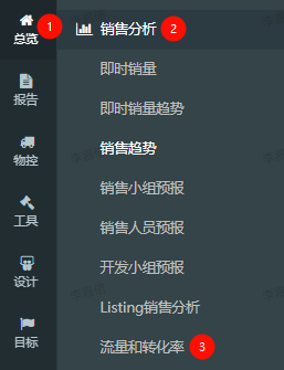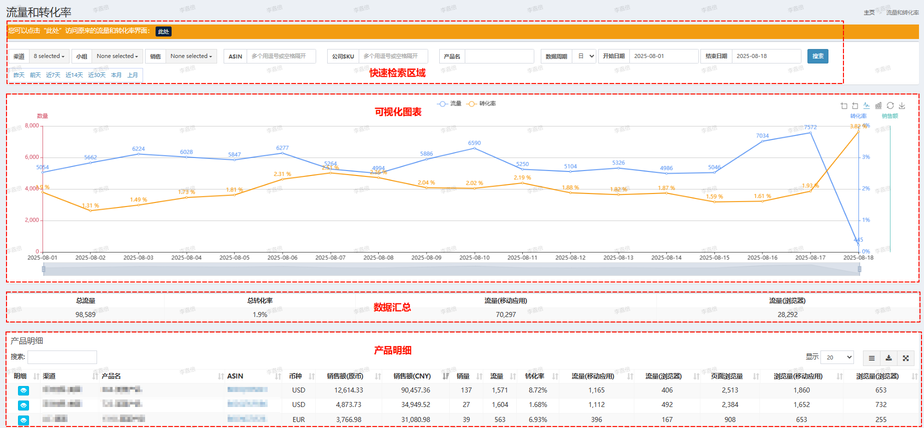 | 数据汇总 | 显示搜索时间范围内的所有流量、转化率数据汇总 |
