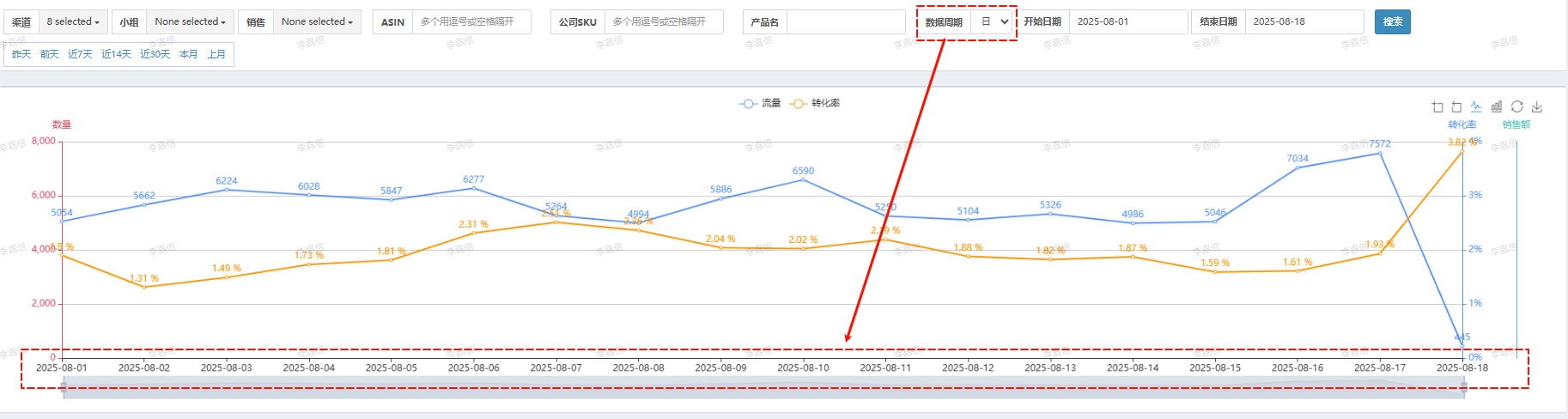自定义不同时间段分析各渠道ASIN的流量和转化率的情况。