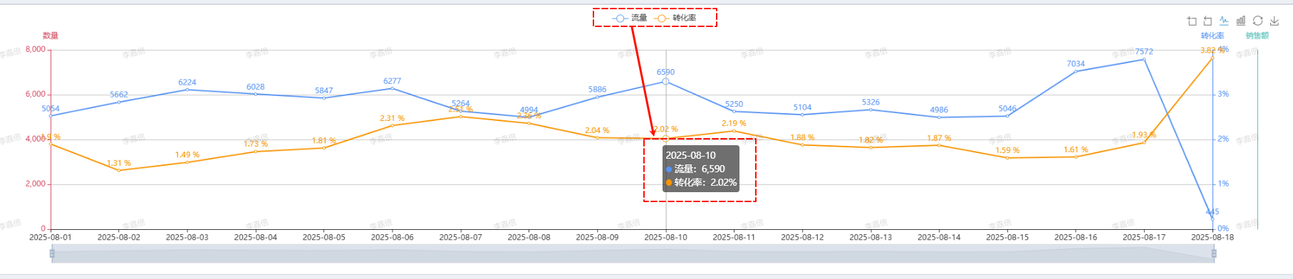 点击图表上方的字段(「流量」「转化率」),可以将字段添加到图表或移除