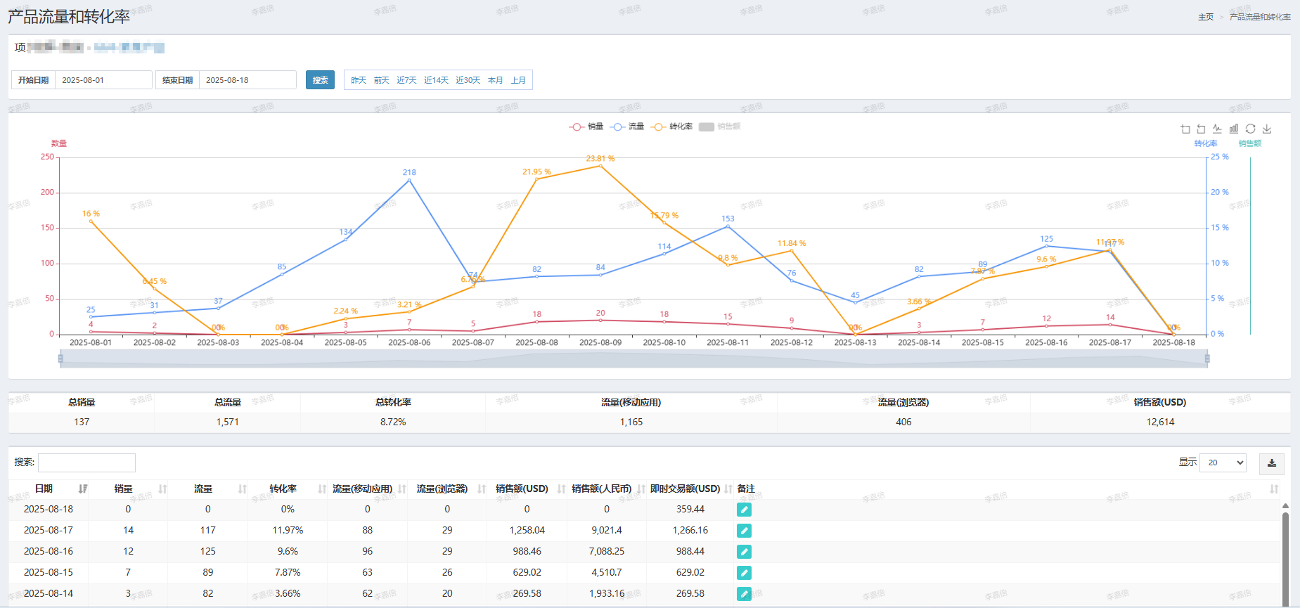 可以对每天的产品情况进行记录,方便清楚了解流量转化率变化的原因,数据支持导出